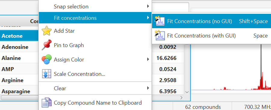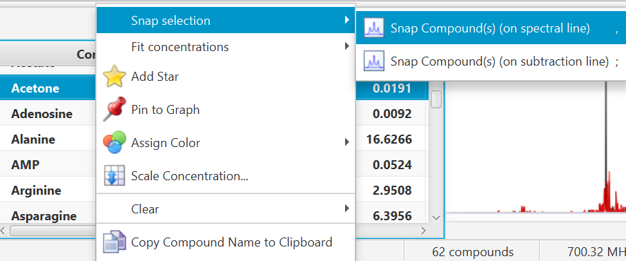 A snapping operation can either be performed on the original spectral line, or on the subtraction line, i.e. by considering the “left-over” signal from everything that has been fit already. It can also be done on a compound selected in the compound table and whose concentration has not been set already.