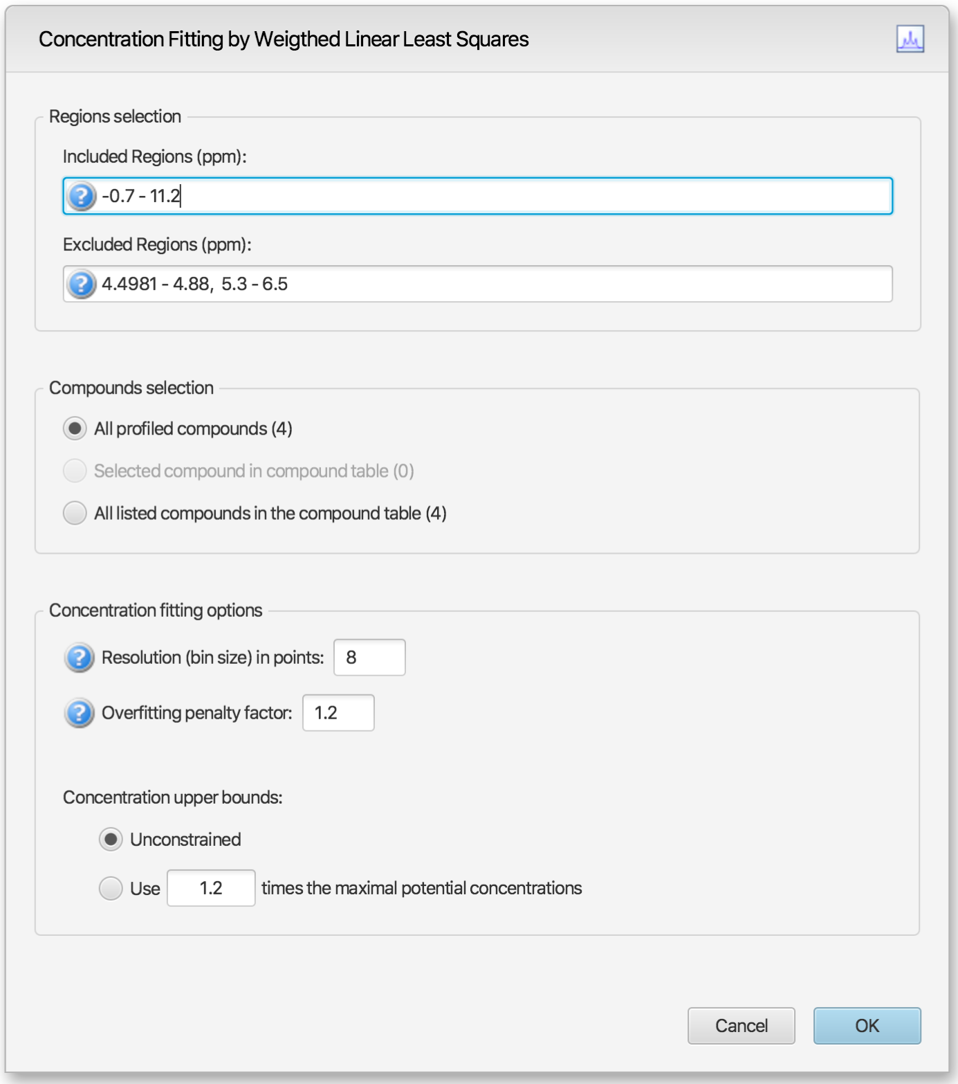 Users can optimize either all of the members of the current profile, all of the currently selected compounds in the compound table, or all of the currently listed compounds in the compound table. Note that compounds that do not have a single peak cluster within the participating spectral regions will not be considered for the fit. Their concentrations will not be changed.